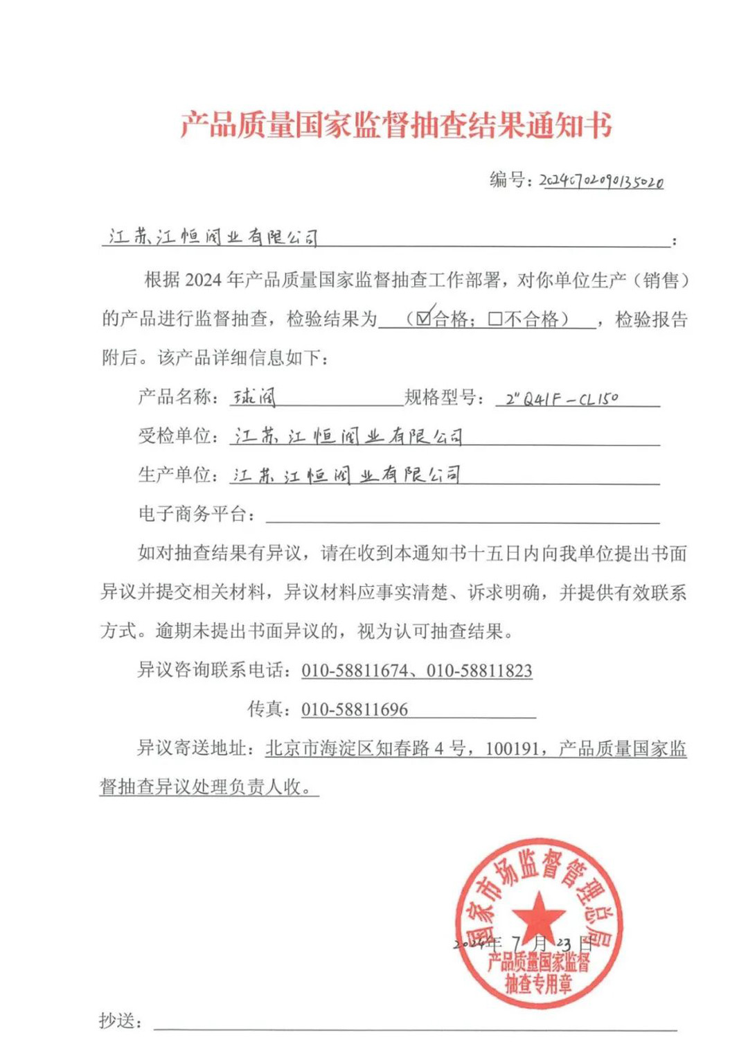 江恒阀业的球阀产品通过国家产品质量监督抽查,意味着其产品质量符合国家相关标准和要求,具有较高的可靠性和安全性。