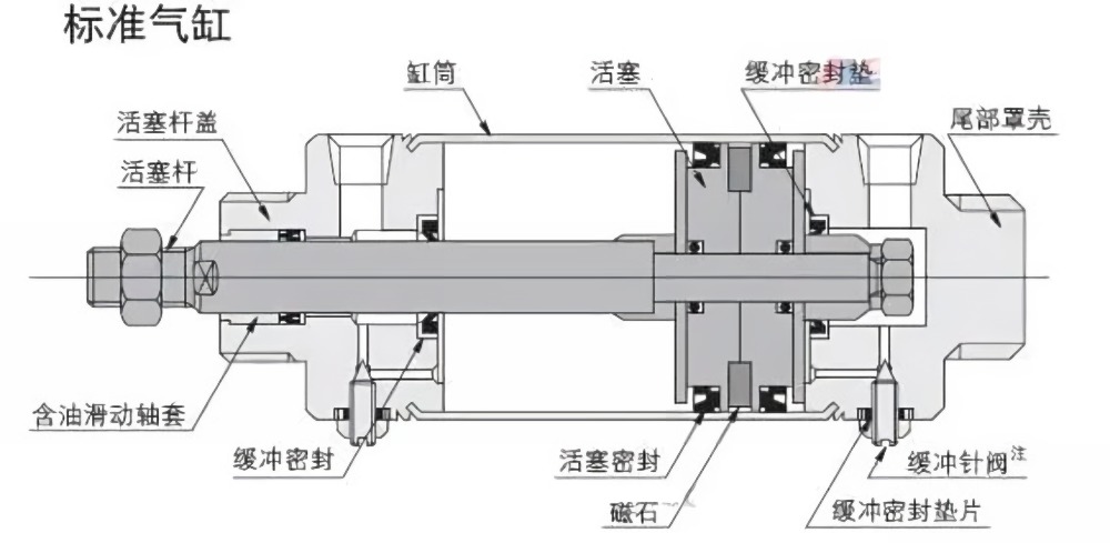 双作用气缸:结构相对复杂,除了气缸筒、活塞、活塞杆和密封件外,还需要两个阀门来控制气体的进出,以实现活塞在两个方向上的运动。