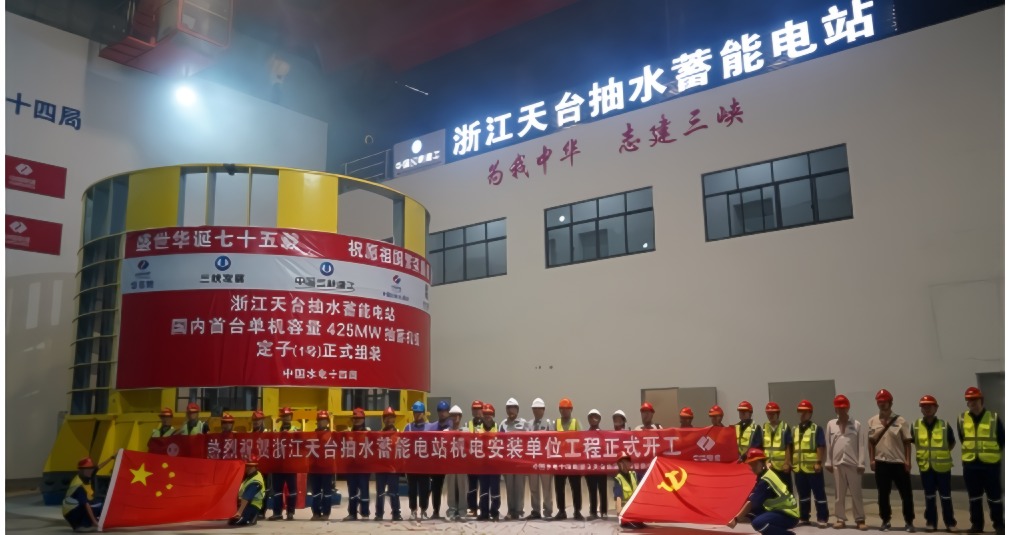 2024年10月8日,从水电十四局获悉,世界水头最高、国内单机容量最大抽蓄机组——浙江天台抽水蓄能电站首台定子正式开始组装,标志着电站1号机组全面转入机电安装阶段。