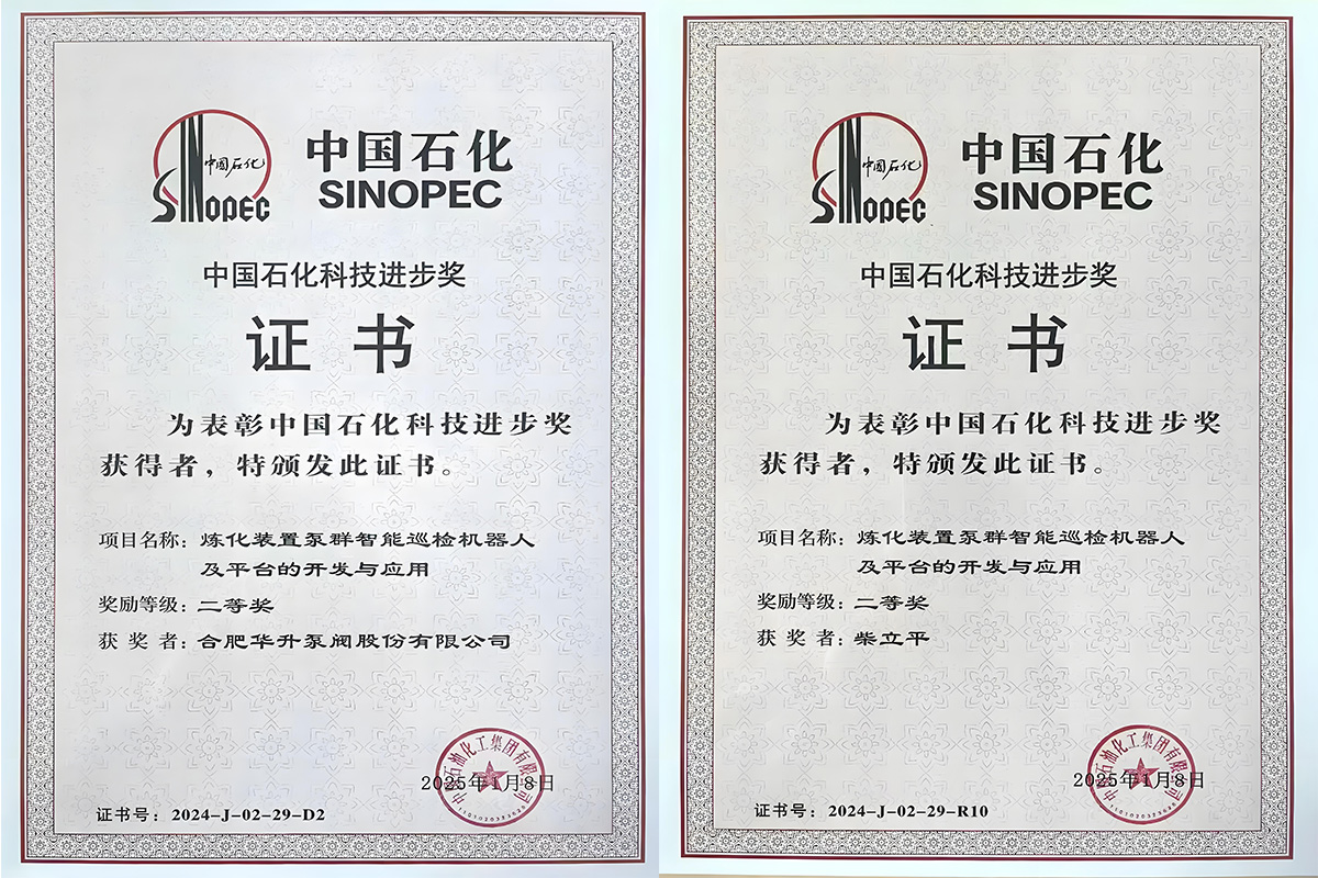 近日,华升泵阀股份有限公司凭借“炼化装置系统泵群智能巡检机器人及平台的开发应用”项目,成功斩获中国石化科技进步奖,并获颁表彰证书。这一荣誉标志着华升泵阀在石化行业智能化、数字化转型领域的技术创新成果获得权威认可。