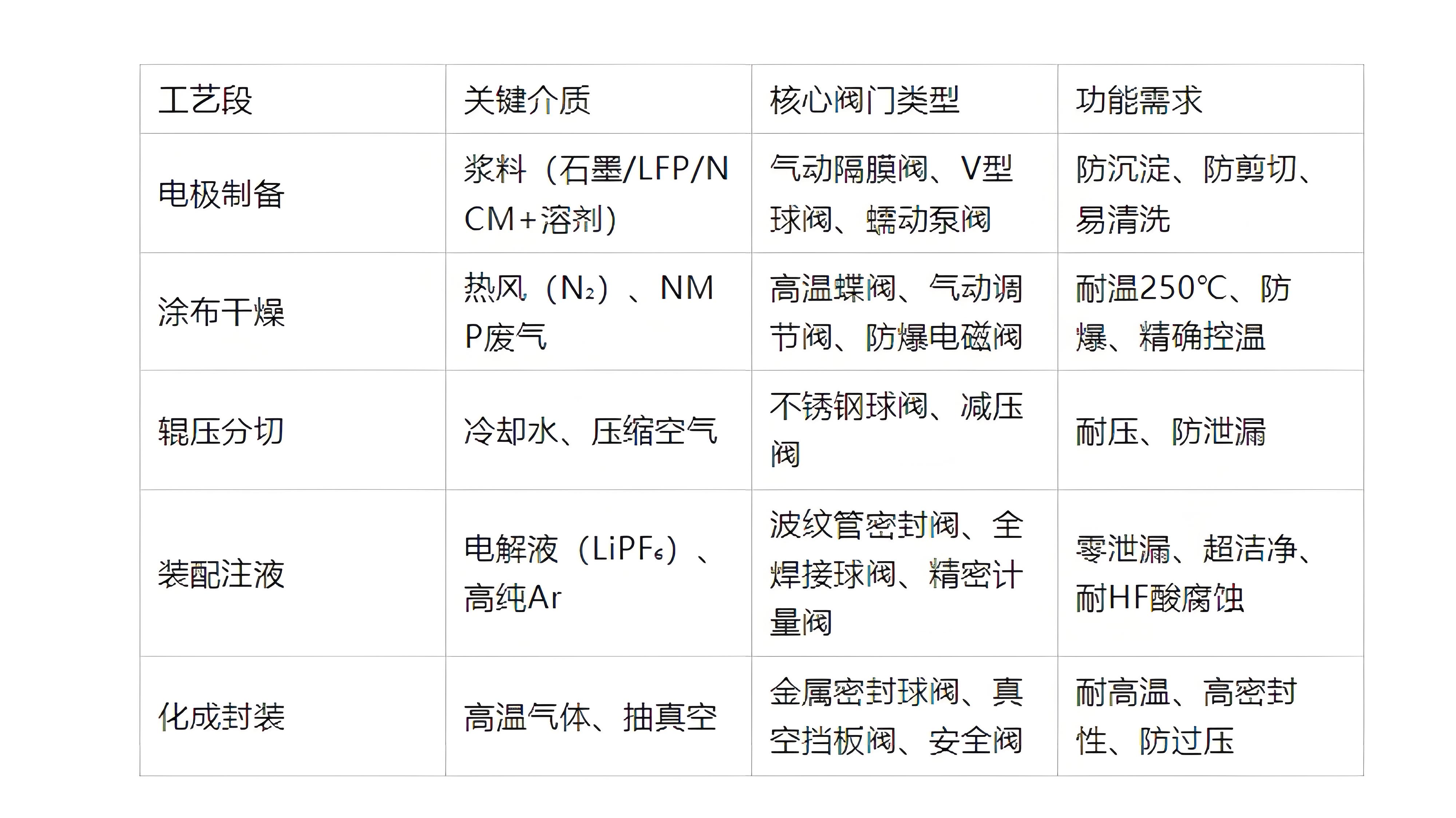 后段(化成):高温老化 → 金属密封球阀(耐温250°C)。注:在电解液系统中,避免使用含铜、锌合金阀门(可能引发锂枝晶短路),优先选用316L/哈氏合金C276材质。